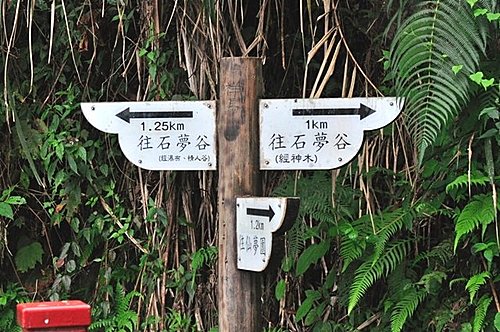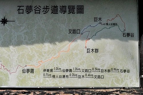 首先行走1.2公里的之字形陡上坡,大約1個小時即先抵達海拔約1300公尺的仙夢園,再續行1.2公里較平緩的山路會遇到一叉路,右側經神木,左側經情人谷、瀑布,皆可通往石夢谷,可採取環走之方式,不過情人谷、瀑布線上攀石夢谷較陡,故建議先取右側的神木線。