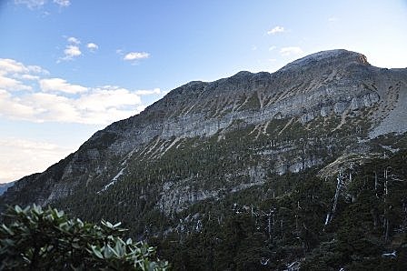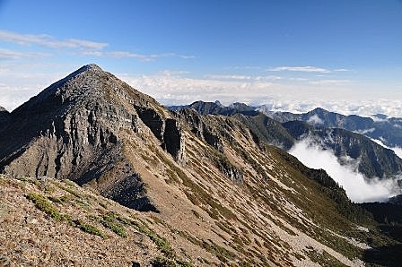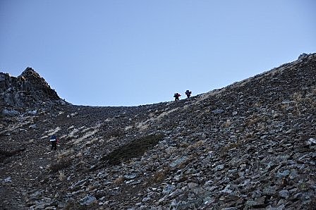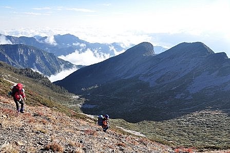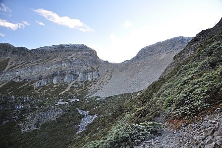 06:15 翠池山屋出發,雪山、北稜角山頭上天氣似乎不錯,這段路的玉山圓柏非常美麗,只是處在這稜線西邊的背陽面,要拍照光線總是略嫌不足,有些遺憾,接近漫長陡峭的碎石坡路段,可以見到最早出發的三人正努力向上攀爬著,而上方晨光斜照在結著白白薄霜的北稜角岩壁上,多麼震撼人心得一種感覺。越接近稜線越是強風凜冽,向下回望,最後出發的二人也正在碎石坡上奮力的攀爬著。