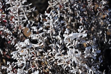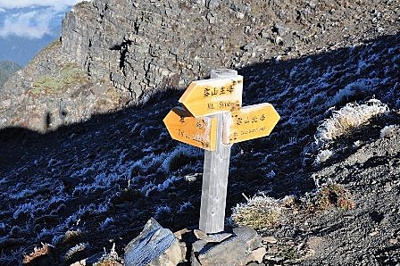 07:23 雪山、雪山北峰四叉路,先後從翠池山屋出發的六人,又在此聚集在一起了,凜冽的狂風讓我打消了上北稜角的念頭,不過既然天氣不錯還是再上主峰去看看吧!休息了10分鐘拍照後,其他山友取陡下圈谷的捷徑下山,我則繼續上雪山主峰。稜線附近低矮的植物都結了霜花、霧淞,頗令人賞心悅目。