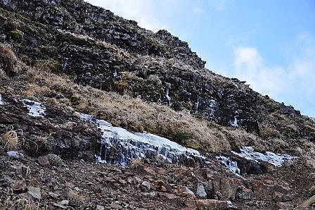 07:53 雪山山頂,東半邊不斷湧上雲霧,終究還是沒有較遠的展望,不作較長的停留,直接循傳統路線下山,途中還有一處山壁上結了不少冰柱,也算不枉再多上主峰這一趟了。
